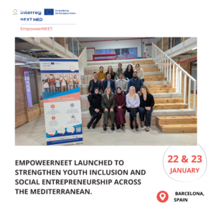 Co-funded by the European Union under the Interreg NEXT MED Programme, with an EU contribution of 89%, EmpoweerNEET has a total budget of €2.3 million and a duration of 30 months. The project addresses persistent youth unemployment and social exclusion by piloting inclusive, place-based pathways for NEET youth, with a strong emphasis on social and solidarity economy (SSE), green skills, and social entrepreneurship.